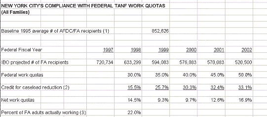 In response to your inquiry, the attached table provides information on New York City’s compliance with the federal work quotas for the TANF funded Family Assistance Program (FA, formerly AFDC). As indicated in the table, the 1996 federal welfare law requires that states meet all-family work quotas that rise 5 percent each year until they reach 50 percent in 2002. New York State has passed responsibility for reaching the federal quotas onto the local districts.