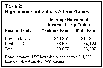 Census data on average household income by zip code corroborates the supposition that members of higher income households are more likely to attend baseball games. (See Table 2.) This tendency is borne out by a comparison of the average household income for the city and the average household income in the fans' home zip codes. The weighted average 1990 household income in the zip codes reported by Yankees fans was $58,627-nearly 40 percent higher than the city resident average of $41,882. Yankees fans from the five boroughs reported zip codes with an average household income of $48,955 about 17 percent higher than the average for all city residents while Yankees fans from outside the city came from zip codes where the average was $63,662 nearly 52 percent higher. For fans visiting from the tri-state metropolitan area, the weighted zip code average income was $67,783-about 62 percent higher than the city resident household average, and indeed almost 18 percent higher than the suburban household average. The zip code average for fans visiting from the rest of the U.S. was $56,630. Survey Methodology IBO surveyed fans at four games with the goal of asking 1,000 fans per game for their home zip codes. The number 1,000 was selected because proportions drawn from an arbitrary sample of that size have a 95 percent probability of being within 3 percentage points of the true proportions. In fact, we obtained zip codes or alternative usable geographic information (for example, Brooklyn, Texas, or France) from 701 and 1,141 for two Mets games, and 925 and 1,101 for two Yankees games. In the case of the game at which 701 fans volunteered information, our estimate has a 95 percent chance of being within 3.6 percentage points of the true ratio if our sample was drawn randomly from all fans. The other games produced more precise estimates. Five IBO surveyors fanned out at each game and polled fans as they entered the various stadium gates. In order to prevent having our data overly affected by lumps of fans from one location, surveyors intentionally skipped many individuals passing through the turnstiles. Similarly, when large groups reported coming from a single zip code, their number was divided by five. Some additional polling was conducted within the stadiums. The two Yankees games surveyed were a weekend game and a weeknight game. Based on the Yankees home schedule, which has 51 weeknight and Friday night games and 30 weekend and weekday games, a weighted average of our two game day estimates was computed (the weekend game had 70% of fans from outside the city, the weeknight game 65%). For the Mets, the games surveyed were a weeknight game and a weekday day game. This latter game was treated as a weekend game and a weighted average was computed based on the Mets' home schedule.