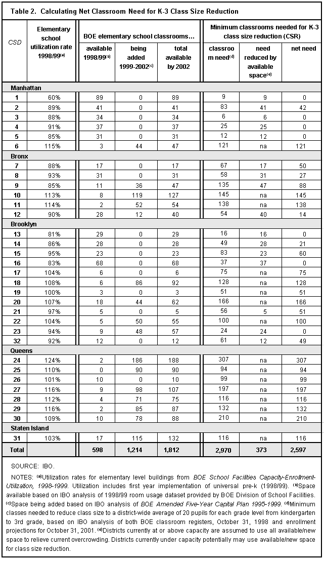 IBO's estimate is based on our analysis of BOE classroom registers for 1998/99, which found a citywide average of 24.9 students per K-3 class. A minimum of 3,144 additional classes would have been needed in 1998/99 to reduce the average to 20 students per K-3 class in each community school district. However, BOE expects K-3 enrollment to decline by 2001/02, reducing the number of classes needed. This will be partially offset by increased need due to projected enrollment growth in grades 4-6. The net effect of these enrollment changes reduces the number of classes needed for 2001/02 by 174, from 3,144 to 2,970.