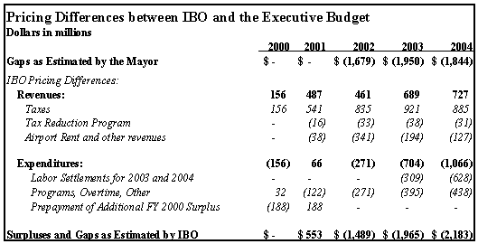 IBO forecasts considerably higher tax revenues than the Administration-$156 million in 2000, $541 million more in 2001, $835 million in 2002, $921 million in 2003, and $885 million in 2004. Despite this, IBO's projected 2004 gap exceeds the Mayor's by $339 million. IBO's higher tax revenue forecast is more than offset by higher estimates of spending-primarily due to including four years of employee salary increases instead of the two included by the Mayor, as well as higher spending for Medicaid, public assistance, education and overtime.