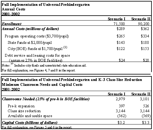 BOE estimates the program costs $3,700 per student annually to operate. State funding for New York City is determined by a formula that does not necessarily correspond to the number of students enrolled. In the current year, the state is providing $67 million, or $2,325 per student expected to enroll. If, however, the state provides its legal minimum funding of $2,000 per student when the program is fully implemented, the city would have to provide the balance, or $1,700 per child.